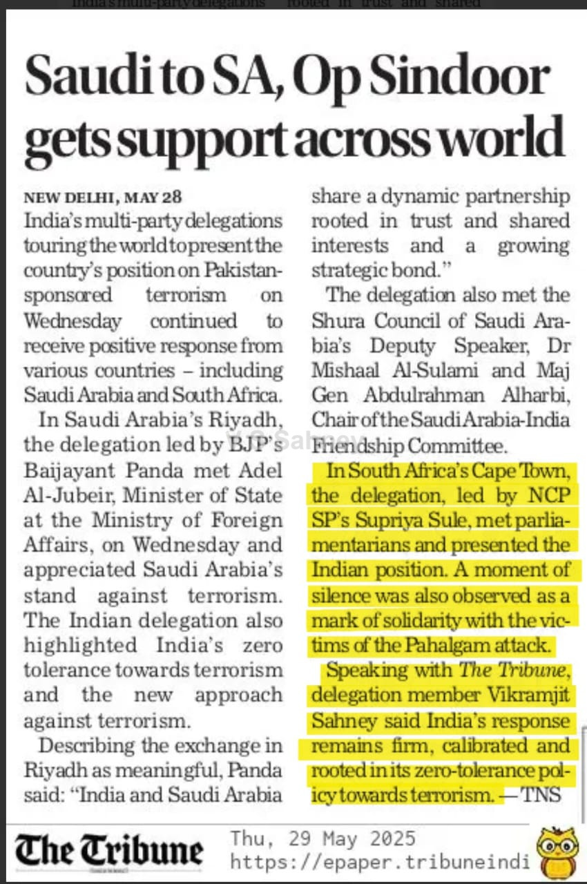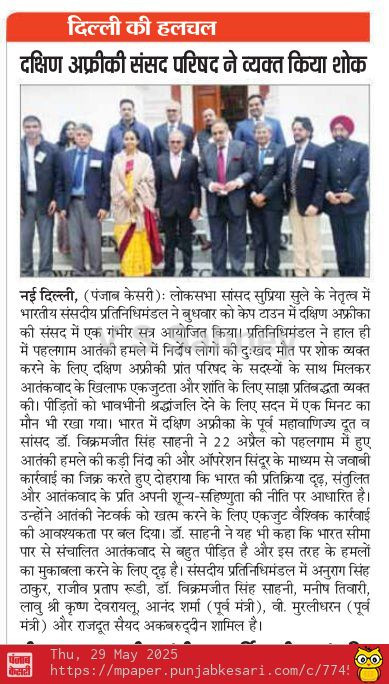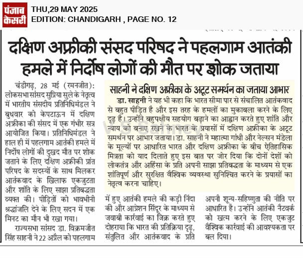 Honoured to be part of the Indian Parliamentary Delegation to South Africa, where I reiterated India’s resolute, zero-tolerance approach towards terrorism. Posted On May 29, 2025 Related Posts MP Vikram Sahney Demands MRTS for Darbar Sahib from Nitin Gadkari Ayushman Bharat Yojana: Punjab MP Vikramjit Singh Sahney questions Centre over settlement of insurance claims AAP nominates Vikram Sahney to Rajya Sabha About The Author Vikramjit Singh Sahney Add a Comment Cancel replyYou must be logged in to post a comment.