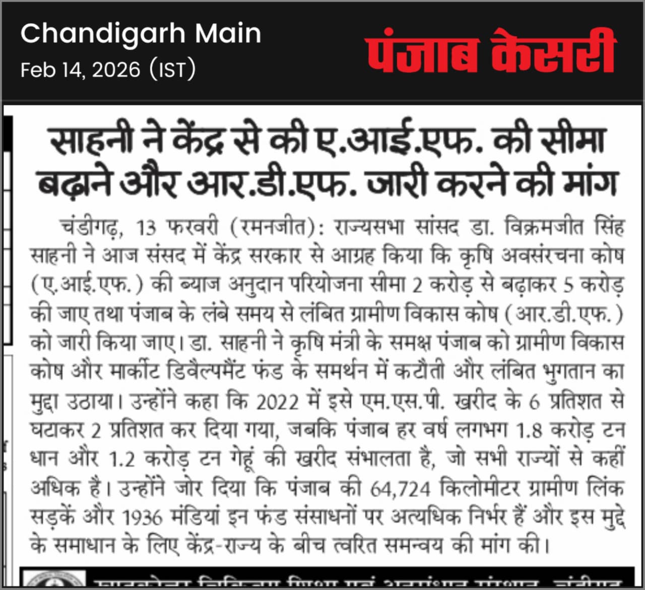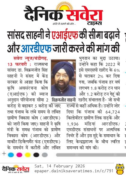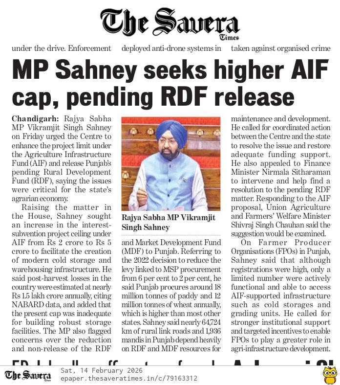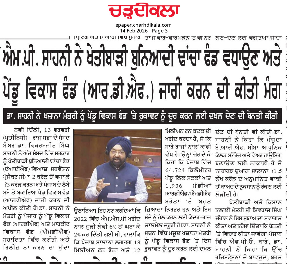 MP Sahney demands enhancing AIF and release of RDF Posted On February 15, 2026 Related Posts On the occasion of Lohri, the World Punjabi Organisation hosted a vibrant cultural program MP Vikram Sahney Demands ₹5000 Crore for Punjab Under Special Assistance Scheme MP Vikram Sahney appeals to all Punjabi MPs to unite for the cause of Punjab About The Author Vikramjit Singh Sahney
