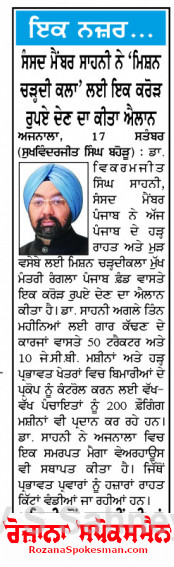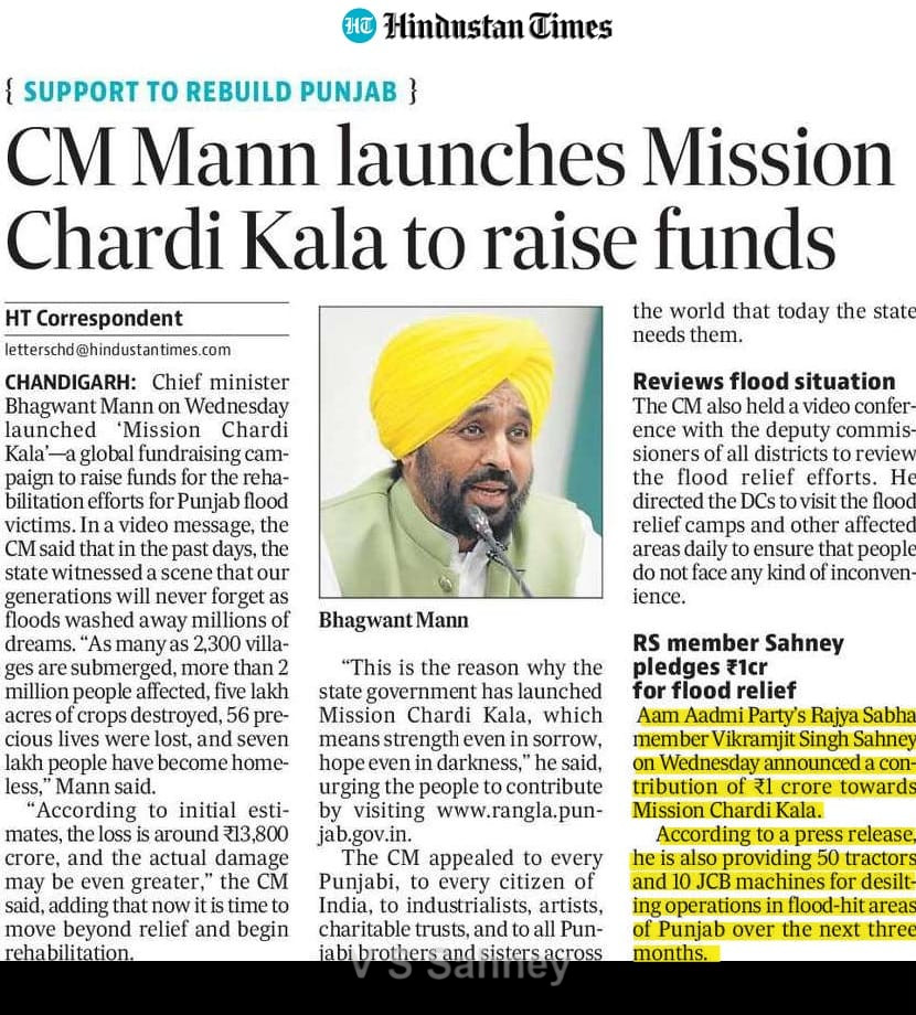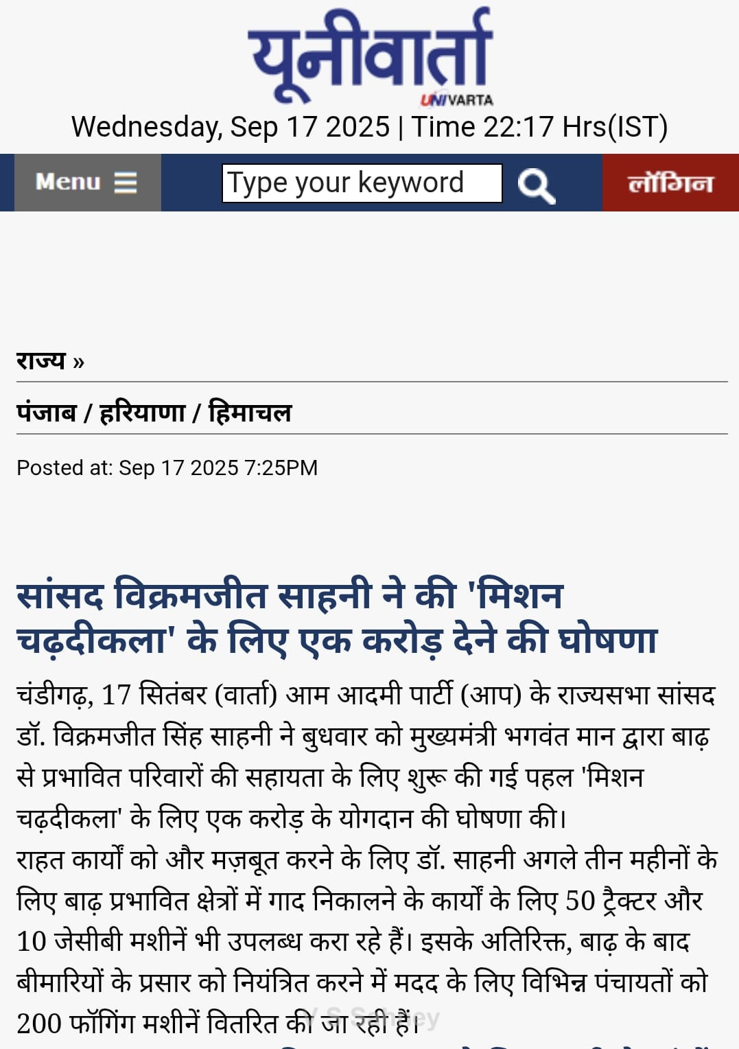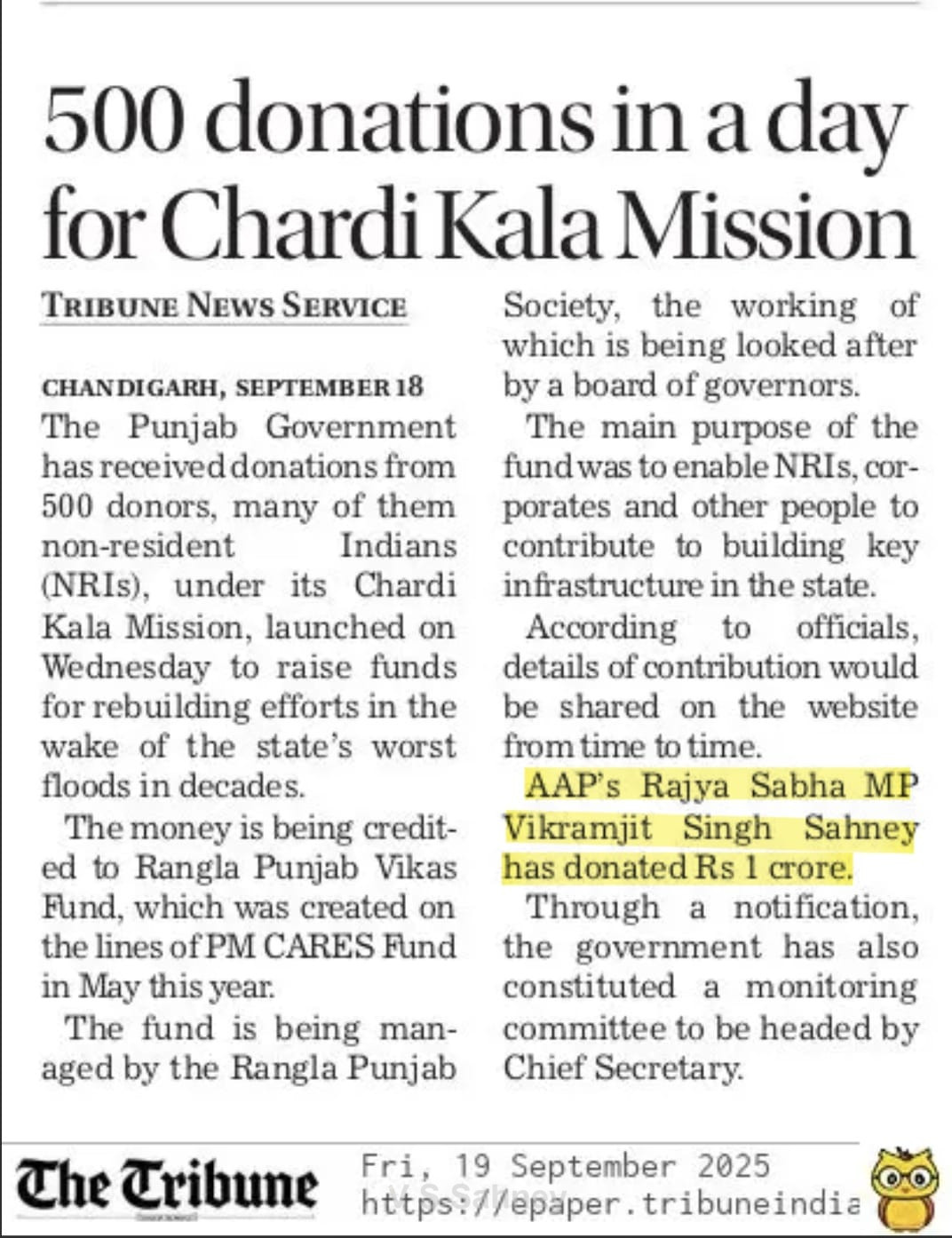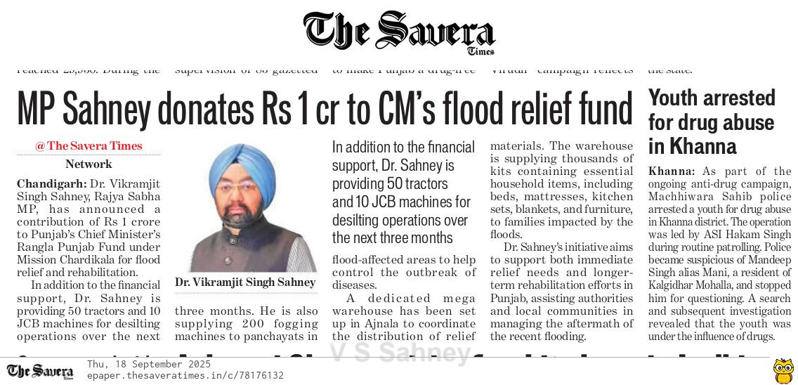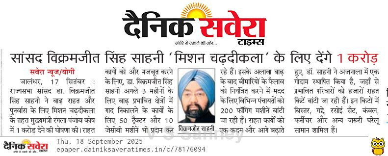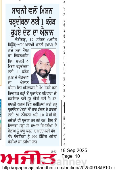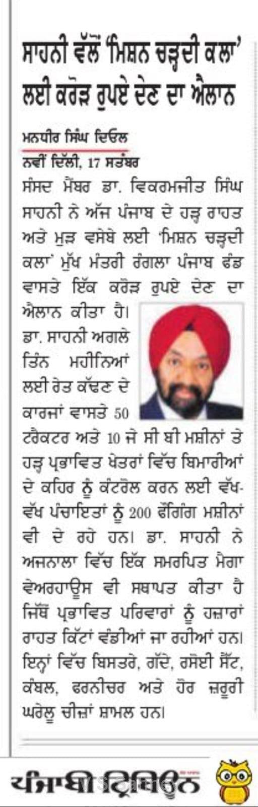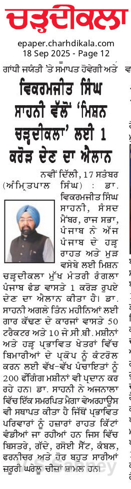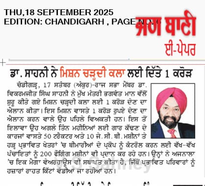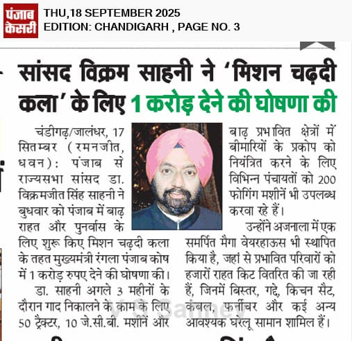 MP Vikram Sahney announces ₹1 Crore for “Mission Chardikala” launched by CM Punjab Posted On September 19, 2025 Related Posts Punjab: Drug de-addiction centre in Patiala gets funds for expansion Sun Foundation Annual Day World Skill Centre to boost employment opportunities: MP About The Author Vikramjit Singh Sahney