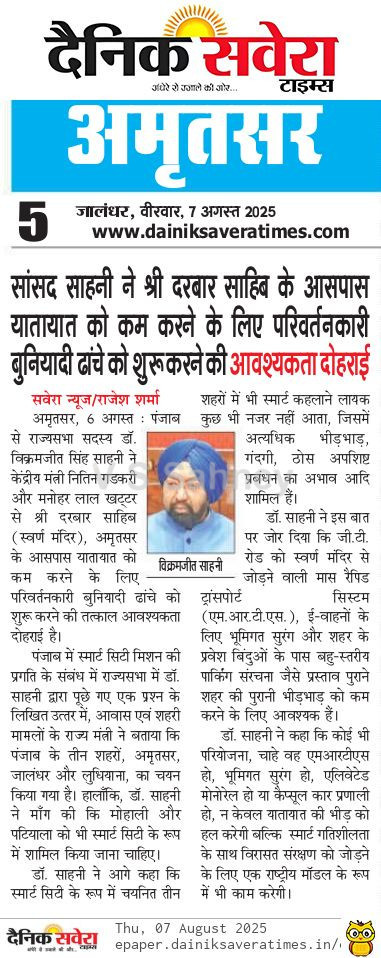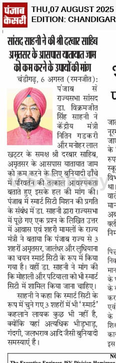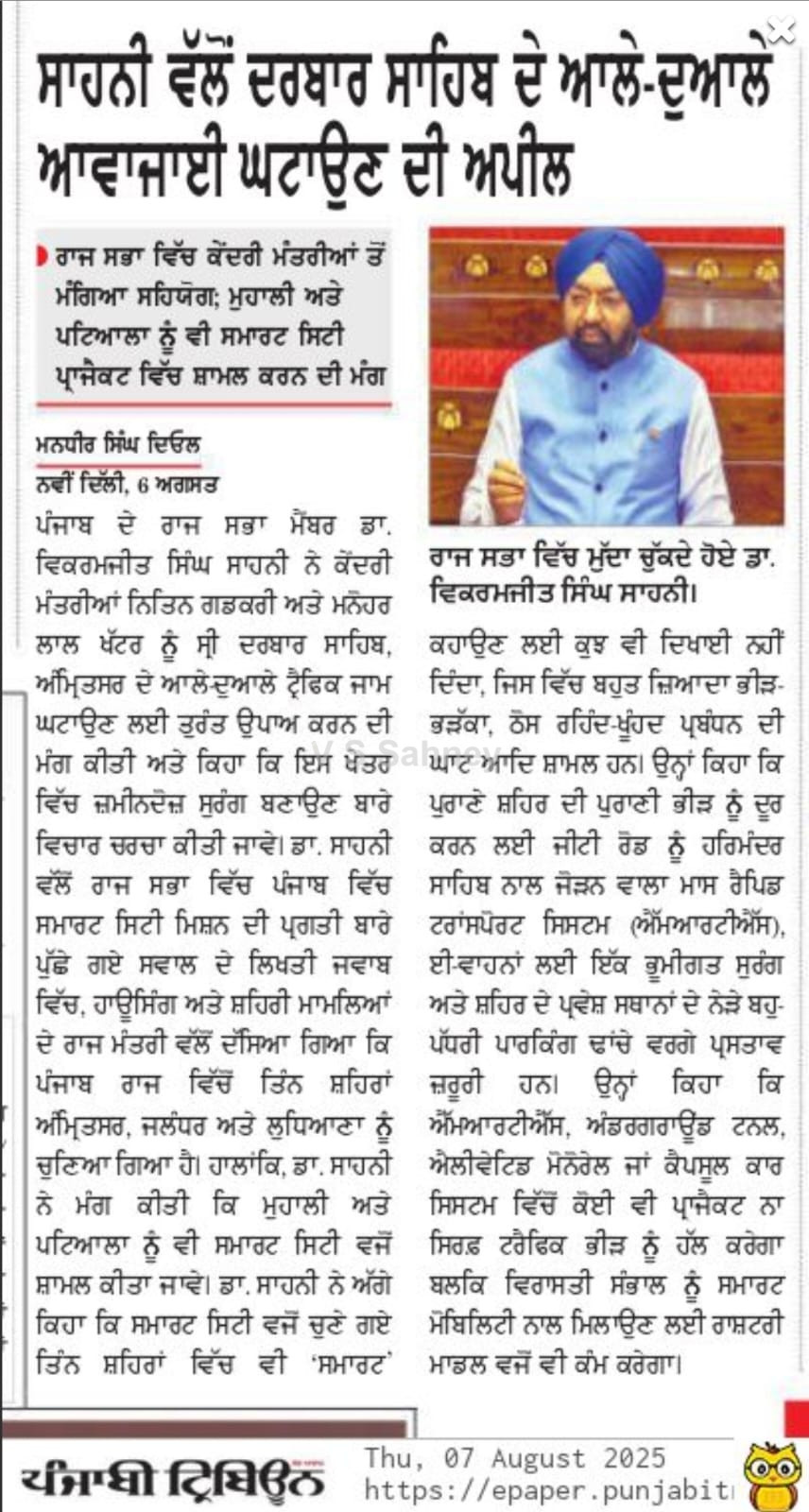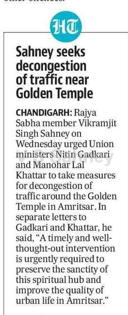 MP Vikram Sahney demands Immediate Decongestion Measures Around Sri Darbar Sahib, Amritsar Posted On August 7, 2025 Related Posts MP Sahney announces grant of 1 crore for Harmandir Sahib 16 Nov 22 – Punjab MP Sahney urges Scindia for direct flights from Canada to Amritsar, Mohali MSP News About The Author Vikramjit Singh Sahney