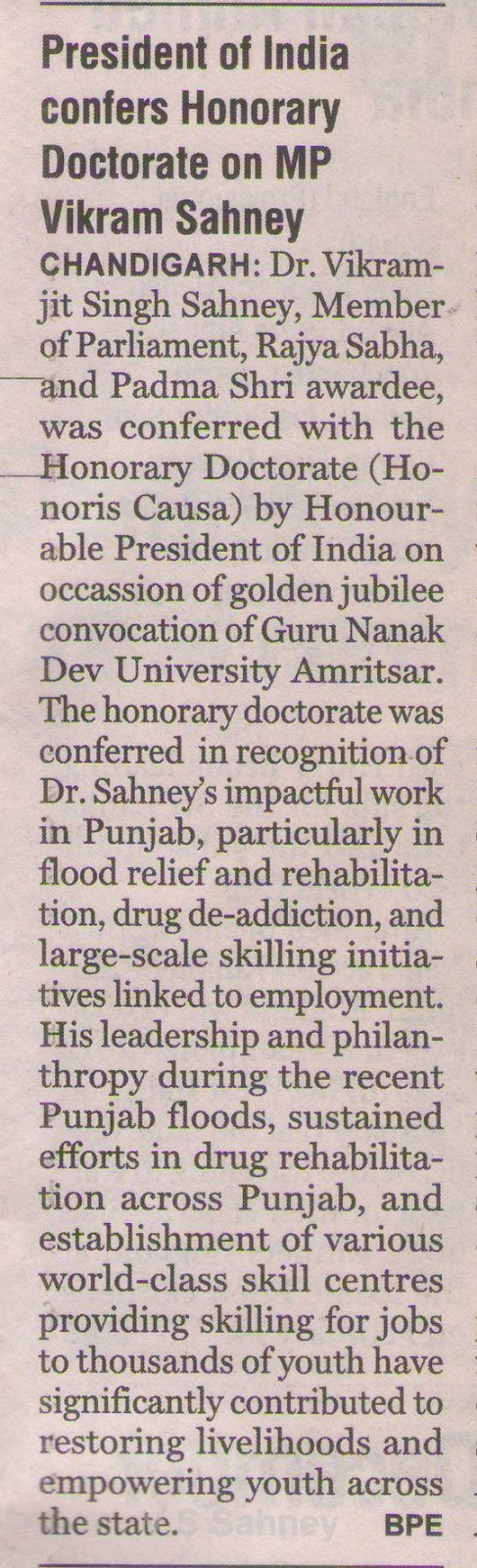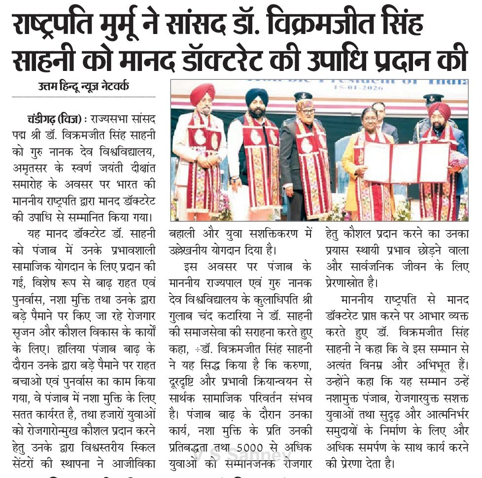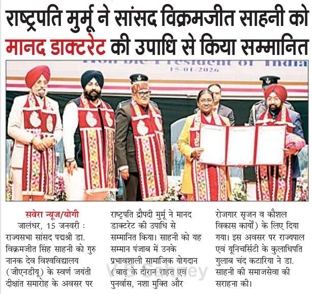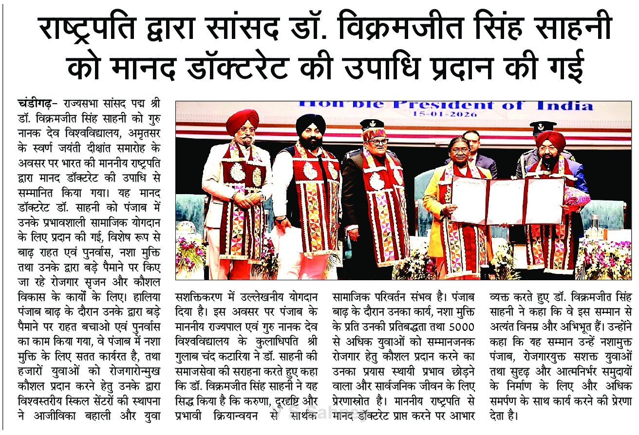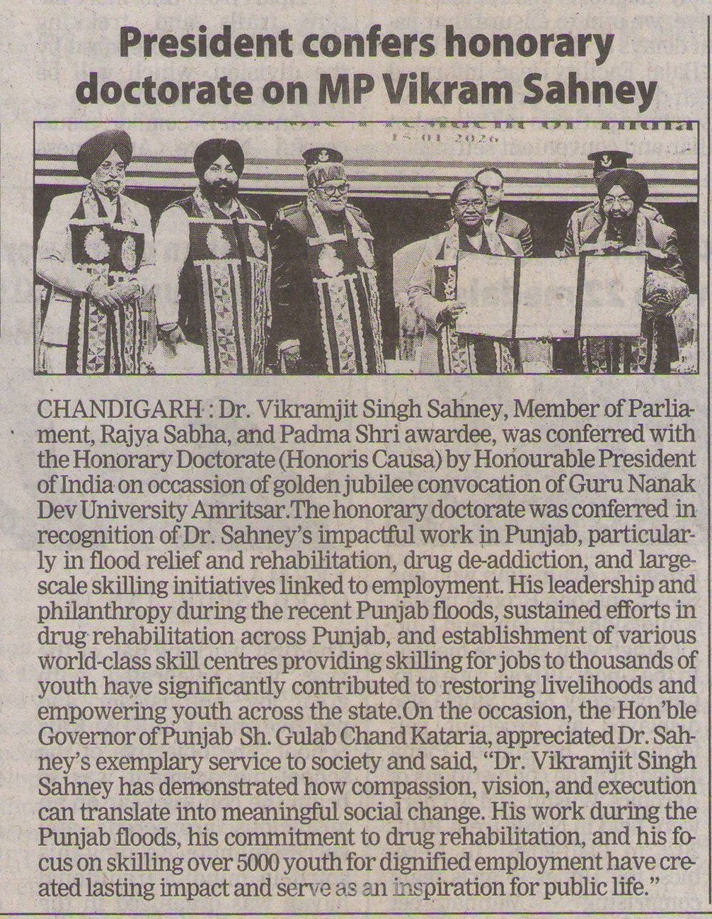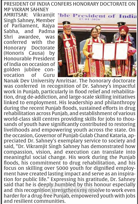 President, Smt. Droupadi Murmu, recently awarded Rajya Sabha MP Dr. Vikramjit Singh Sahney an Honorary Doctor of Literature (Honoris Causa) Posted On January 18, 2026 Related Posts MP asks for more flights to UK and Canada from Punjab MP Vikram Sahney Appointed as Vice Chairman of National Apprenticeship Council MP, Vikram Sahney announces Rs. 1 Crore for Drug Rehab Centres About The Author Vikramjit Singh Sahney