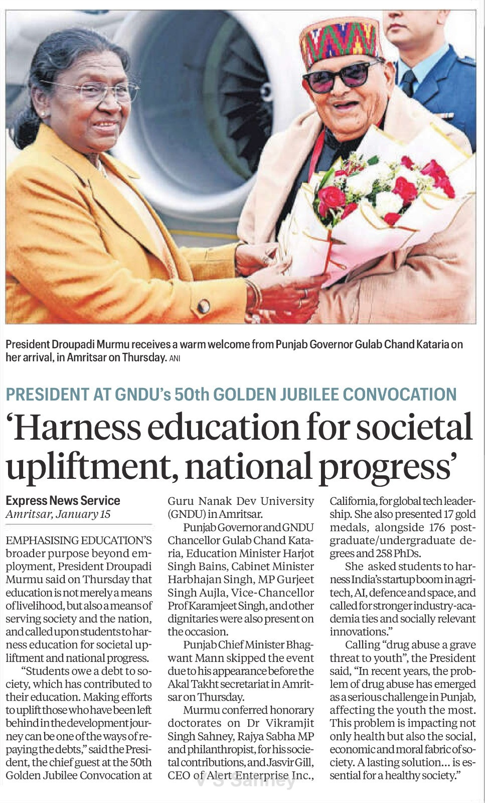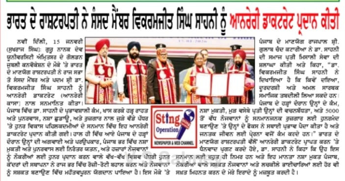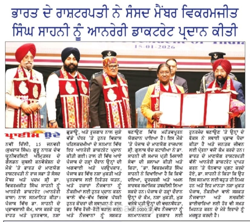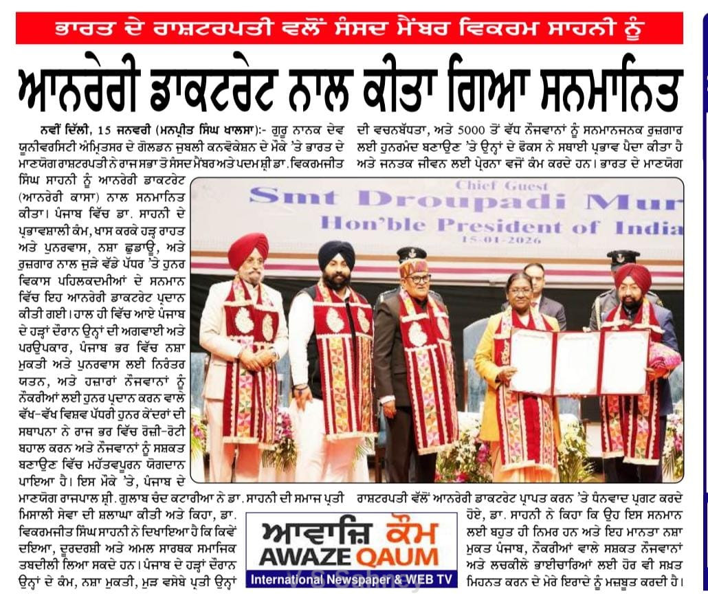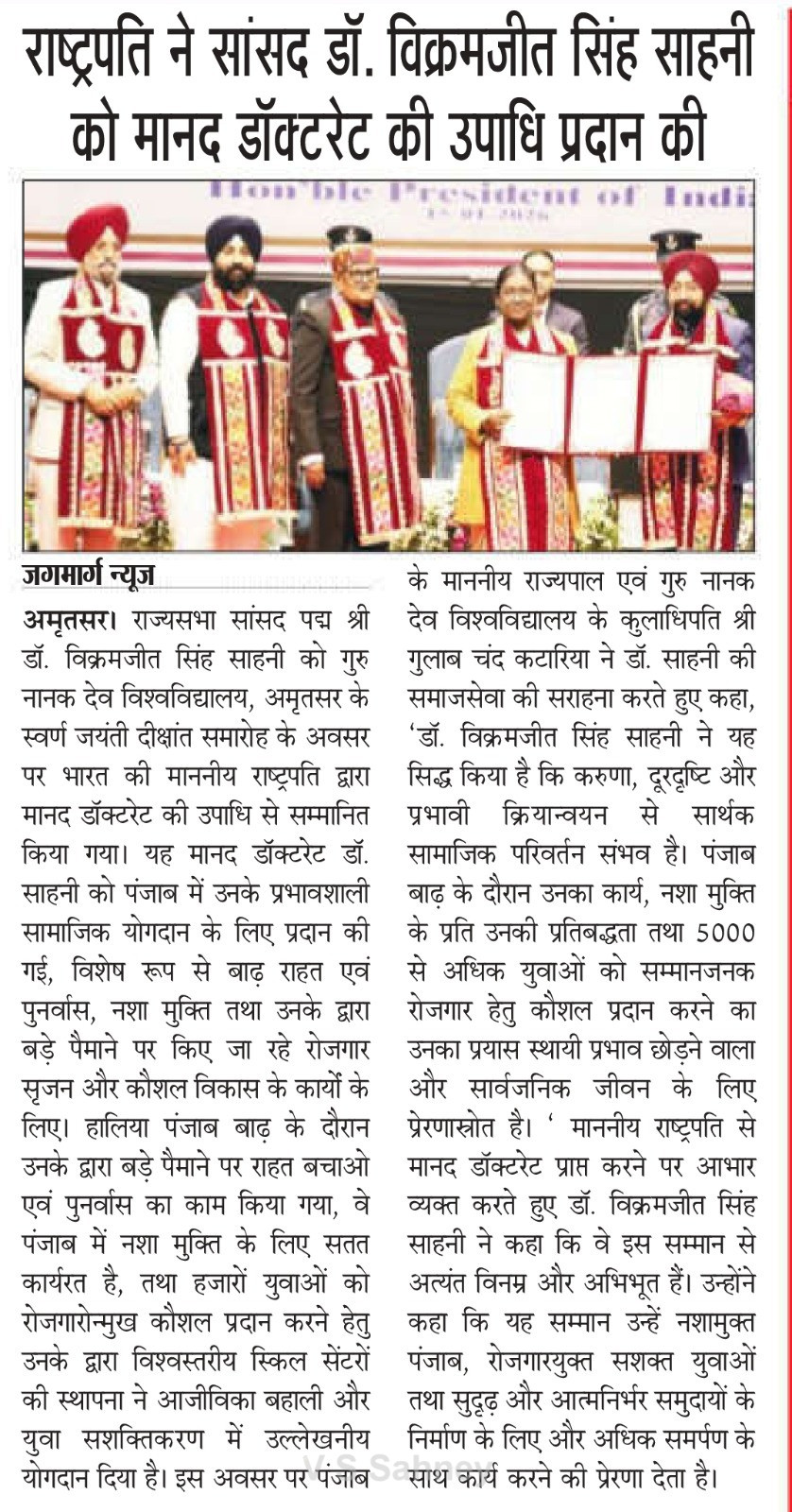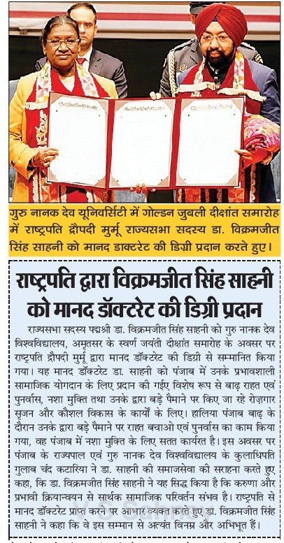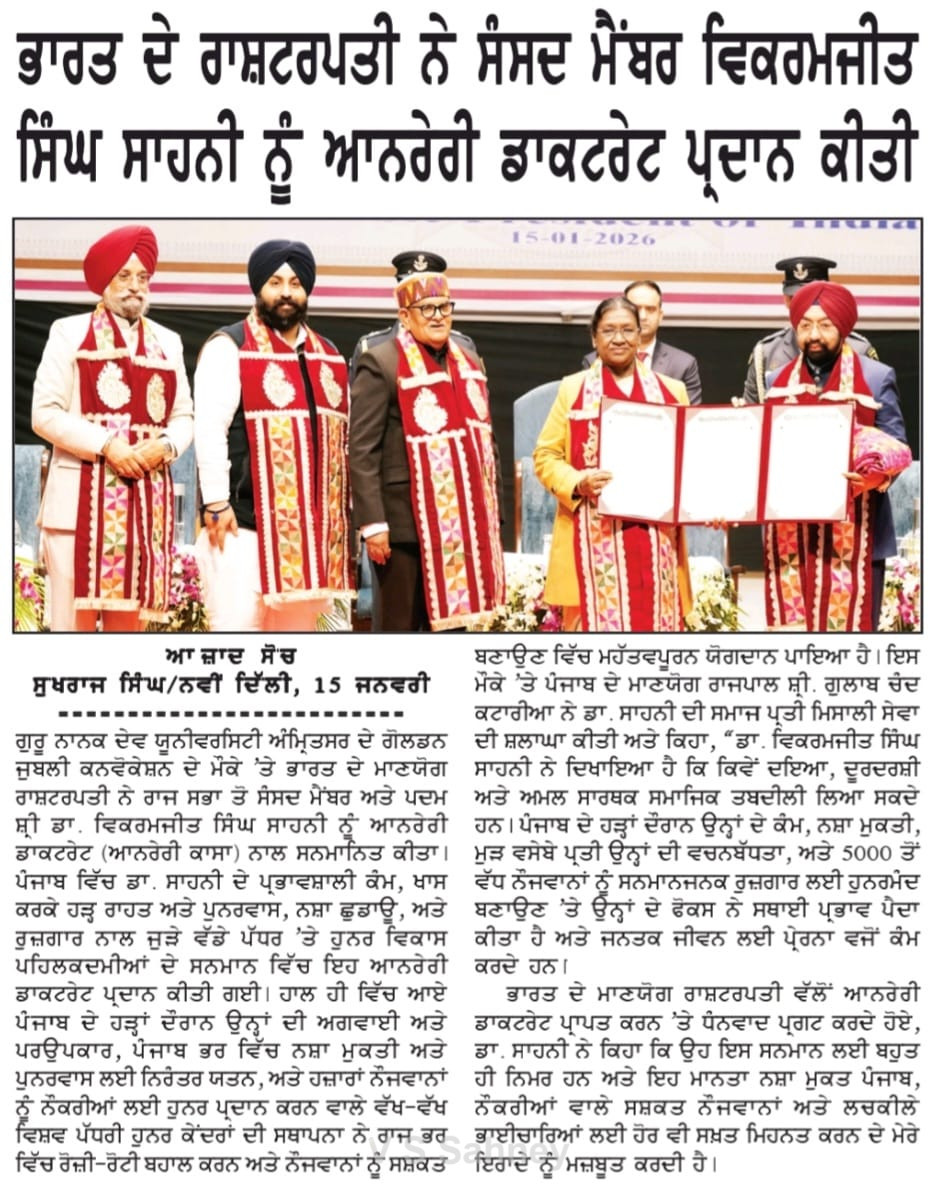 President, Smt. Droupadi Murmu, recently awarded Rajya Sabha MP Dr. Vikramjit Singh Sahney an Honorary Doctor of Literature (Honoris Causa) Posted On January 18, 2026 Related Posts MP asks for more flights to UK and Canada from Punjab MP Vikram Sahney Appointed as Vice Chairman of National Apprenticeship Council MP, Vikram Sahney announces Rs. 1 Crore for Drug Rehab Centres About The Author Vikramjit Singh Sahney