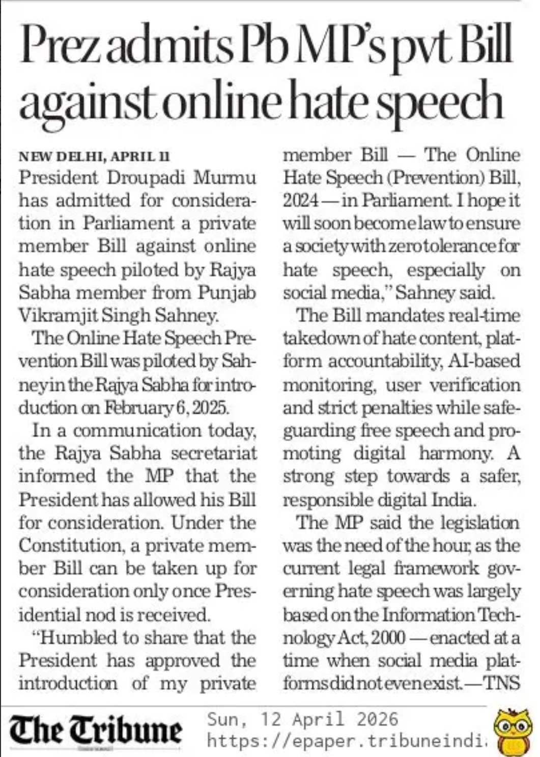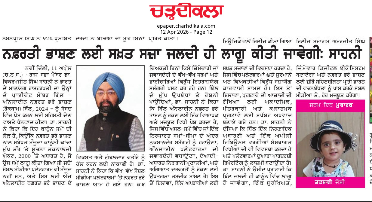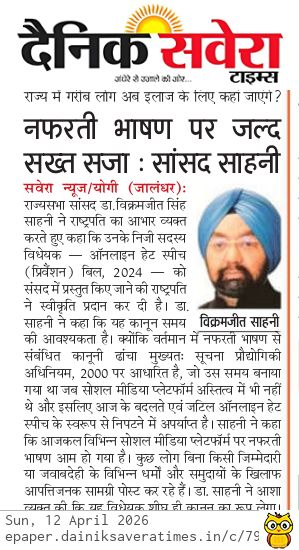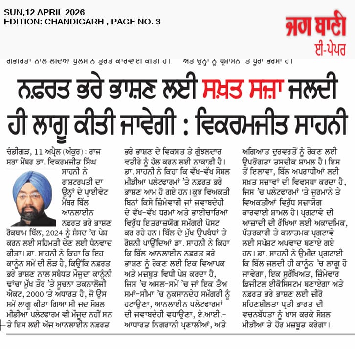 Strict Punishment for Hate Speech Soon : MP Sahney Posted On April 13, 2026 Related Posts MP Vikram Sahney to take up issue of MEP on Basmati rice MP Sahney Urges Punjab Government to Submit Project Proposals for ₹5,000 Crore to Centre for Assistance MP Sahney announces grant of 1 crore for Harmandir Sahib About The Author Vikramjit Singh Sahney